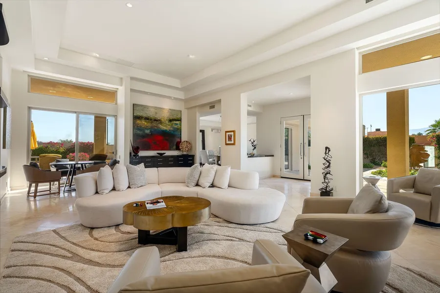 Nestled in the heart of Rancho Mirage, this exceptional estate perfectly combines luxury, privacy, and resort-style living. Set on nearly one acre of lush, beautifully landscaped grounds, the property showcases breathtaking panoramic mountain views and timeless desert elegance. The sparkling pool and spa is enhanced by tranquil water features and surrounded by multiple lounging areas-ideal for sunbathing, social gatherings, or peaceful evenings under the stars. For those gatherings there's a built-in BBQ, generous patios, and several inviting spaces for dining and entertaining al fresco. Step inside this four-bedroom home to find expansive, light-filled living spaces designed for effortless relaxation and stylish entertaining. A true chef's kitchen with large central island. The three-room guest suite offers an expansive serene retreat for visitors. This Home is adjacent to the 200-acre ...