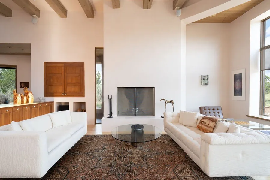 Step into this extraordinary Las Campanas residence where modern design and tranquility adjoin. Nestled on 2.3 acres, this 3-bedroom 3 1/2 bath home exemplifies sophistication and style. Upon entering, you are greeted by a dramatic gallery hall with luxurious stone water feature. The main room floods with natural light, highlighting an inviting open-concept floor plan. An expansive gourmet kitchen offers a well-designed central island and cozy sitting area, a footprint that is both spacious and comfortable. High-end appliances and design features throughout the home are accented by tall ceilings and clean lines. The primary bedroom features a fireplace, two expansive walk-in closets, and a luxury bathroom with dual vanities, soaking tub, and walk-in shower. The guest wing contains two spacious guest rooms, each with ensuite bath, providing exceptional comfort and privacy for visitors. En...