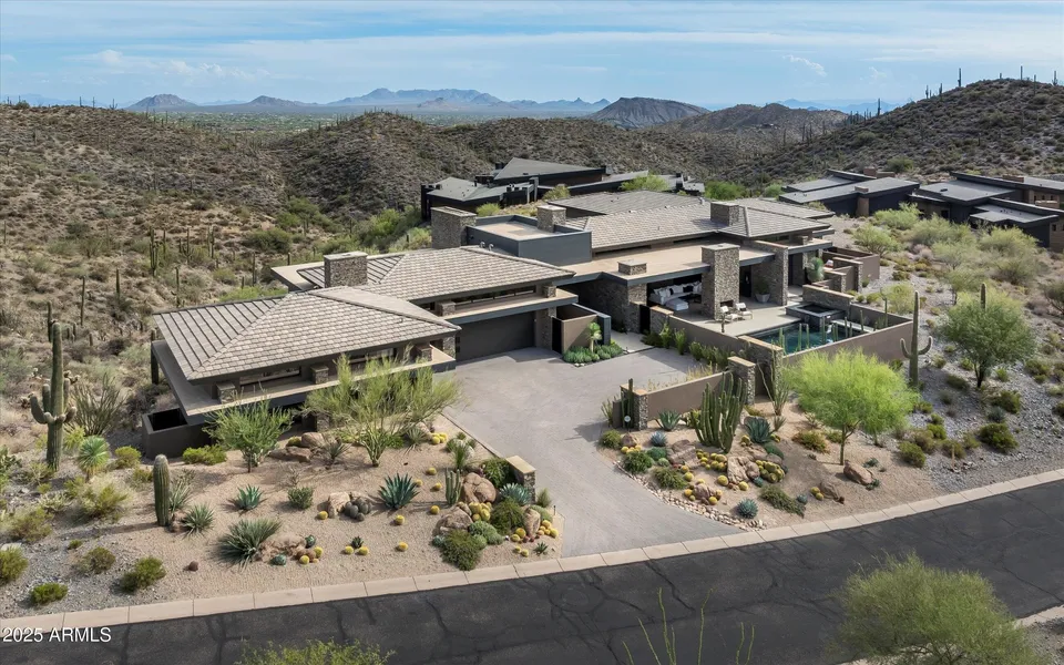 Sophisticated Contemporary Elegance... A very private estate nestled into the pristine desert setting of Cintarosa Ranch, the crowning star of Desert Mountain's upper villages... Surrounded by both near and distant mountain vistas, and convenient to the community's award-winning private 25- mile hiking trail system. The refined interior and exterior architecture by JK Design features a one-level, sleek, low-profile character and utilizes natural elements of stone, glass, wood and steel to harmonize with the Sonoran desert beauty. Exquisite succulent gardens, viewed from each room and patio, exude a Zen ambiance throughout. Each room offers walls of glass with dramatic vistas, while also creating inviting warmth and coziness. The open great room plan anchors the home and resort patios. The smartly appointed foyer introduces a theme of residential elegance, soothing color palette and thoughtfully curated furnishings found throughout the home. The great room features a soaring stone hearth enriched with flanking library shelves, a floor-to-ceiling glass wine center, and glass walls that open to both the north and south entertaining patios, all enhanced by soft light of a sleek, circular chandelier. The chef's kitchen with state-of-the-art Wolf appliances (including steam oven) and breakfast bar boasts a hidden secondary kitchen and pantry. The nearby dining room offers a built-in buffet and opens to its own large patio that features banco seating surrounding a rectangular fire pit, south valley views, sunsets and city lights. The luxurious master suite and spa bath offer two generous outfitted closets, and a glass shower opening to a private garden. Three well-appointed guest ensuite bedrooms (one currently an office) each offer a private patio and complete the main home. A detached casita, consistent in style with the main home, is your guest's dream. Its great room features a hearth, dining area and full kitchen. The spacious, private bedroom offers views of Continental Mountain. The main patio, accessed by the great room and master suite, offers a generous and protective overhang creating a handsome exterior living and dining area. Tongue-and-groove wood ceilings and a soaring two-sided stone hearth extend the elegance and coziness of the great room. Heaters and fans promise year-round comfort. A BBQ center with a full-length granite-topped buffet completes the covered area. The spacious, private sun deck completes the main patio and features a full-sized swimming pool and adjacent spa (easily accessed by the master suite). Owners and guests alike enjoy the dramatic profile of Continental mountain and succulent gardens that surround the pool. Throw an after-bocce pool party or settle in for a quiet and cozy evening by the hearth in your outdoor living room. A car collector's garage offers 8 spaces: a three-car extra-deep tandem garage with extra-high ceilings, two of which are currently stacked to park a total of 8 cars. Great storage with a full wall of built-in storage cabinets and an additional storage room. The smart home offers multiple TV's, and includes an expandable Crestron system that currently controls security, climate, music, shades and pool. The home is located at the world-renowned Desert Mountain Community and Private Club featuring 7 golf courses and club houses, 10 restaurants, Sonoran Fitness and Spa, Tennis, Pickleball, Bocce, 25 miles of private hiking trails and a myriad of year-round activities for the entire family. An on-site concierge medical facility is located adjacent to the Club's executive offices. A Desert Mountain Golf Membership is available from the Club and requires a 30-day application process. Details are available from the Club. A wait list may apply.