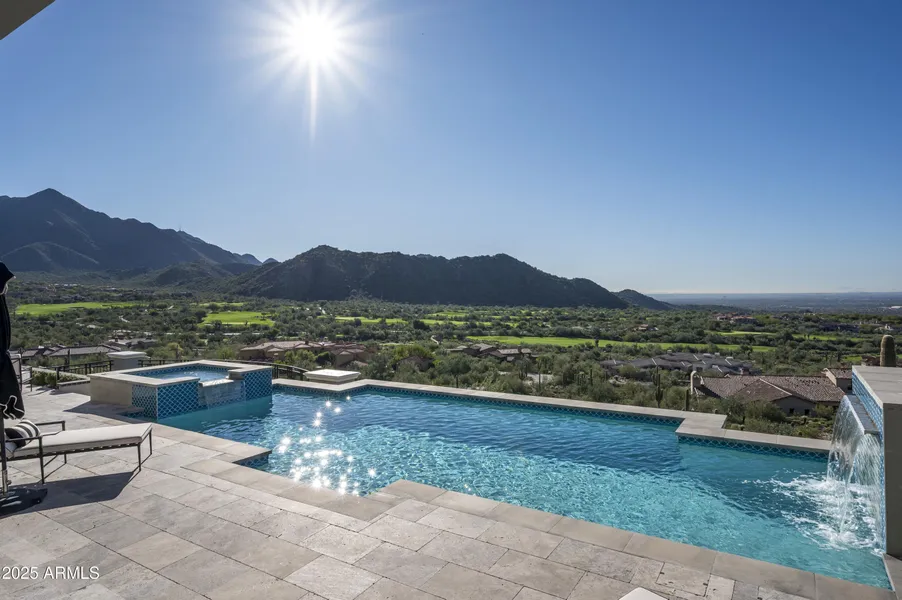 Situated on a quiet cul-de-sac in the Upper Canyon at Silverleaf, with desirable south exposure, this 2021 modern mediterranean residence captures sweeping 180-degree panorama of the McDowell Mountains, southeastern sunrises, and sparkling city lights to the southwest. Multiple fairways stretch across the southern horizon, creating an open view corridor that is rarely available within the community. This rare single level home offers 6,615 square feet is thoughtfully designed to maximize both views and livability, with four bedrooms, four full baths, two half baths, office, TV Room and exercise room. The floor plan emphasizes seamless indoor-outdoor living, with expansive windows throughout, that frame the surrounding landscape and fill the interiors with natural light. The main living spaces are anchored by clean architectural lines and refined finishes, complemented by three fireplaces that add warmth and definition across the home. The kitchen and entertaining areas open effortlessly to the outdoors, creating an ideal setting for both daily living and hosting. Set on just under 2 acres, the property provides exceptional views and privacy. The resort pool and spa are positioned to take full advantage of the south-facing orientation and mountain backdrop, while multiple outdoor areas invite year-round enjoyment. A gated entrance invites you onto this estate with a generous auto court and 5-car garage. Conveniently located with easy access to the Parks at Silverleaf with tree lined streets and 9 different parks, this home combines architectural clarity with one of the most compelling view settings in Silverleaf.