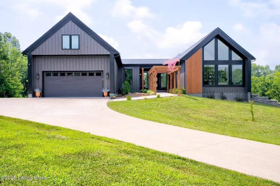 Prepare to be WOWED with this unique and stunning 3 year ''new'' home. Built by Schumacher Homes and completed in December of 2022, this open plan is an entertainer's dream, both inside and outdoors. Located in Spencer County on a private 9 acres, this home features an incredible outdoor space which includes a 20x40 in ground pool with pool deck entry and slide, pool house, full bath house, pavilion with refrigerator, covered back porch with vaulted wooden ceiling, and stocked pond. Coming up the drive, one will be impressed with the curb appeal of this home. The pavers walkway to the covered front porch is highlighted by a stained wooden pergola that complements the dark siding of the home. A real standout. The front door blends in with the modern style of the home. Once inside, you'll notice that this plan was built with views to the outside as a priority. Large windows everywhere flooding the space with natural light. The floor plan is an "H" shape with the foyer in the middle, great room, kitchen and lounge (office) on one side and the bedrooms and baths on the other. Spanning the space between the "H" outside is a fabulous and huge Timber Tech deck overlooking the pool area with entrances from the great room and primary bedroom. The great room space showcases a vaulted ceiling with beams and a gas fireplace with tile surround extending to the ceiling. A great focal point. Not to be missed is a wall of windows looking out to the rear of the property. The doors lead out to a fabulous covered patio with vaulted wooden ceiling and paved floor. The great room accommodates the dining room as well with plenty of space for a large gathering table. So now let's focus on the amazing kitchen. Featuring white cabinetry and quartz counters, this kitchen hides a big surprise. The tall cabinet doors open up leading into a butler's pantry room, or "messy kitchen" in today's terms. This room serves as a walk-in pantry with wrap around solid shelving, separate storage closet, base cabinet with sink and beverage fridge and even a window with remote shades. Very cool design and amazing storage. The kitchen is outfitted with stainless Jenn-Aire appliances throughout which remain with the home. Release your inner chef with the Jenn-Aire 5 burner gas chef stove and touch control stainless hood. Around the corner from the kitchen and facing the front of the house is a lounge/office room with an expanse of windows to make the work day better. The wall unit shelves with ladder can remain. On the other side of the foyer is a coat closet and a half bath featuring quartz countertop. The primary bedroom has a vaulted ceiling and faces the back of the property overlooking the pool area and pond. There is an accent wall for your headboard which adds a nice touch. Across from the bed is a wall of windows, maximizing the view for the perfect wake-up call or star gazing in the evening. Primary bedroom windows have remote shades for privacy and light blocking. The primary bath features tile floors, a soaker tub surrounded by windows, double vanity with quartz counter, walk in tiled shower with glass enclosure and a walk in closet with custom shelving. Down the hall are two other bedrooms, both with two closets. One is currently set up as an office. There is a convenient mudroom with built-in shelving and cubbies for dropping off items when entering the home. The laundry room is an efficient space with a sink cabinet, and two wall mounted fold up/down tables for ease of doing laundry. The washer and dryer can remain with the home. The basement walkouts to the side of the house and here you'll find a finished bedroom, family room and a full bath with walk in tiled shower. There is also an area plumbed for a kitchen. And an amazing amount of space for storage or future expansion. Outside is the heated pool (propane) which is concrete with stainless steel lined walls. The bath house features a full bath with walk in shower - no need to go inside to get cleaned