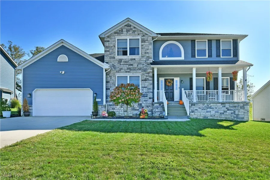 9 years left on the tax abatement. There's treasure hidden in plain sight within this highly desirable Columbiana neighborhood! Nestled away deep within the development, this daring two-story home instantly excites with its bold blue frontage and complimentary stonework that continues to the peaked roofline above. A covered front porch makes for a perfect fall hangout while a fenced-in backyard allows you to take full advantage of the expansive composite deck space, easily containing dining, lounge and potential spa areas. Step inside the prominent foyer to find the rising carpeted staircase and balcony overlook. A fantastic home office space spills away, adjacent to a hidden half bath. Meanwhile, a family room or parlor makes for an easy play area opposite the stairs. Formal dining follows behind with great backyard views. Stealing the show, a rear great room showcases the elaborate combined kitchen and casual dining space while the deep-set living room looks on to reveal a stone trimmed fireplace and large window that spill sunshine across the hardwood styled flooring below. First floor laundry is located near the garage entrance. Meanwhile, stone countertops grace the central island, pairing masterfully with a tiled backsplash and decorative hanging lights. Upstairs, don't miss the thrilling master suite with its breathtaking full bath and naturally lit soaking tub. A second full bath is found mid hall, joining the trio of spacious guest bedrooms. Call today to be first through the door!
