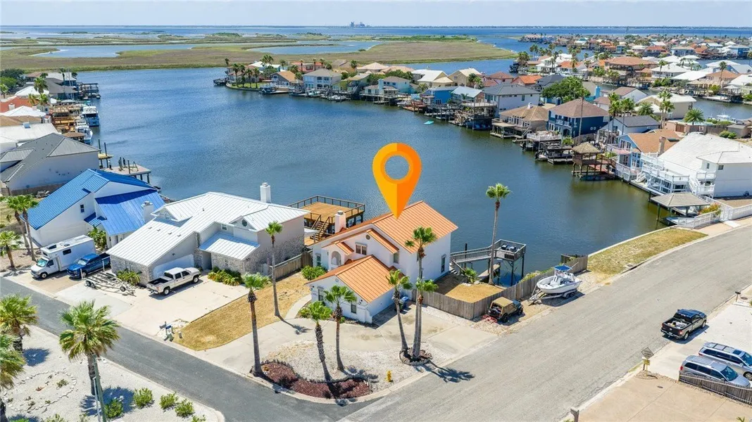 WATERFRONT DREAM HOME ON NORTH PADRE ISLAND... Ready to live the island life? This 3-bedroom, 2.5-bath home sits on a big corner lot right on one of the widest canals. With 2,293 sq ft of space, it's got everything you need to kick back, entertain, and soak up the coastal vibes. Inside, the spacious open concept living area features a cozy wood-burning fireplace, a wet bar equipped with filtered cold water & icemaker - plus great windows that offer stunning water views of the canal. The kitchen is a total win for anyone who loves to cook! It features custom wood cabinetry, a beautifully crafted wood-front refrigerator, rich granite counters, center island and a gas stove ready for home-cooked meals. The main bedroom is on the first floor and opens onto the deck-perfect for morning coffee with a view. The primary bath complete with his & her sinks, a large jet soaking tub for relaxation and a walk-in tile shower. A stunning wood staircase leads to the second floor where there's a bonus space that could be a playroom, office, or workout zone plus two guest bedrooms and a full bath. Throughout the home enjoy a mix of tile and wood flooring, blending durability with timeless style. Outside is where the fun begins -Two decks with killer water views, an electric boat lift, and a side yard that's perfect for furry friends... or maybe that dream POOL. The house also features a durable aluminum metal roof, New 4 Ton A/C Compressor December, 2025, sprinkler system, 220 plug in garage for RV & is equipped with hurricane shutters for added storm protection. Location! Location - you've got quick access to the main canal, and it's just a short boat ride to the yacht club and Laguna Madre. Whether you're into fishing, boating, or just chilling by the water, this place has it all. Come see why life's better on the island. Now Come Coast Awhile...