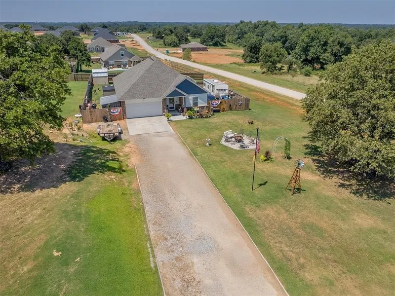 Welcome to 15952 Prairie Rose Drive-where peaceful country living meets thoughtful design and modern comfort. Built in 2021, this 3-bedroom, 2-bathroom home sits on a spacious 0.86-acre corner lot in a quiet, tucked-away neighborhood that offers a true sense of community without sacrificing privacy. Step inside to discover an open-concept layout with a split floor plan. The primary suite is thoughtfully separated from the secondary bedrooms, offering extra privacy for everyone. The large kitchen island is the heart of the home-ideal for entertaining, meal prep, or gathering with loved ones. This home is anything but cookie-cutter, featuring custom touches throughout-including a cozy fireplace with a beautiful mantel and built-in storage, and a dedicated workspace off the two-car garage, perfect for tools, equipment, or hobby projects. Enjoy Oklahoma sunsets from your covered back patio, surrounded by gorgeous landscaping, a new fence with backyard access, and not one, but two storage sheds for your extras. The long driveway adds curb appeal and extra parking, and the large lot gives you room to stretch out and enjoy the outdoors. If you're looking for a home that offers modern convenience, custom charm, and the feel of country living-this is it.