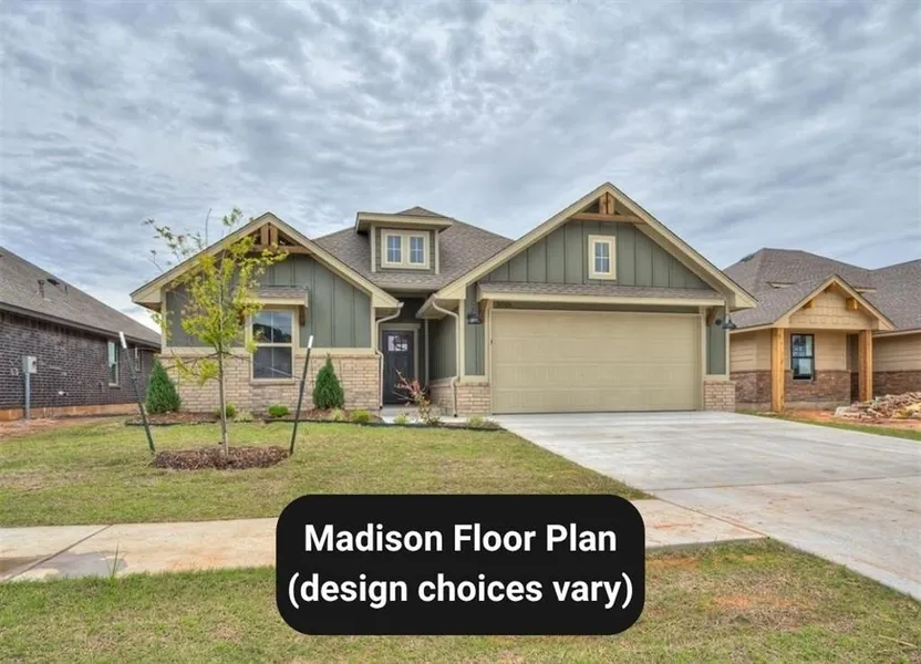 This open-concept home is located in Noble, just 10 minutes from the OU campus, and features a spacious living area with a ceiling fan and a tile-framed electric fireplace with mantle. The space flows seamlessly into the kitchen with a large island and sink, custom cabinetry, tile backsplash, quartz countertops, and a gas stove, oven, and microwave. A pantry, nearby laundry access, and a mud bench add everyday functionality. The private primary suite includes a double vanity, soaking tub, and oversized walk-in closet. Guest bedrooms offer generous closets, the guest bath features a tiled tub-shower combination, and a covered patio extends the living space outdoors. A 10-year structural and manufacturer's warranties provide added peace of mind.