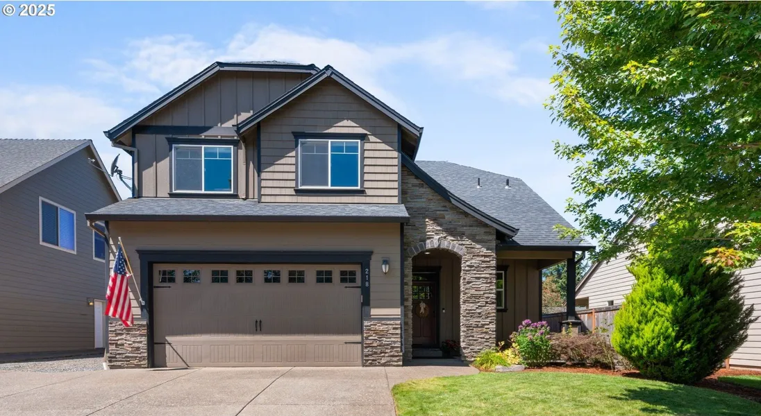 Beautiful custom-built 3-4 bedroom, 2.5 bathroom house in one of Molalla's sweetest neighborhoods. The Finney's Landing neighborhood is known for its quality craftsmanship and many standard upgrades. These homes look and feel different. Built in 2014, this house has a cultured stone arched entryway welcoming you to a spacious front porch, perfect for seasonal decorating. The main level features a dedicated entryway/foyer, 9-foot ceilings throughout, gas fireplace and hardwood floors in the entry, kitchen and dining area. The well-appointed kitchen includes granite countertops, a large island, stainless steel appliances, gas range, and a walk-in pantry. Get cozy in the living room with a gas fireplace and beautiful custom built-ins. Upstairs, the vaulted bonus room provides flexible space-ideal for a media room, home office, playroom, or 4th bedroom. The oversized owner's suite offers vaulted ceilings with an ensuite bathroom and walk-in closet. Outside, enjoy a covered patio, fully fenced backyard, landscaping, sprinklers, RV parking and a multi-purpose storage shed. Just blocks from Clark Park, coffee shops, Molalla Aquatic Center, shopping, Buckaroo Grounds and the high school. This home has the space, comfort, and upgraded features you're looking for!