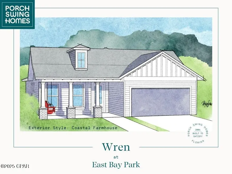 Welcome to the Wren, a thoughtfully designed 3-bedroom, 2-bathroom new construction home with just under 1,600 sqft of stylish and functional living space. Designed and built by local builder Porch Swing Homes, this residence combines quality craftsmanship with a true sense of home. Located in East Bay Park, an HOA-free neighborhood less than 10 minutes to Tyndall Air Force Base, it blends modern efficiency with timeless charm. The inviting oversized covered front porch, complete with a classic porch swing, sets the tone for the warmth and comfort you'll find inside. Step through the 8 ft front door to enjoy spray foam insulation, energy-efficient appliances, and oversized windows that fill the home with natural light. The open-concept kitchen features a walk-in pantry, large island, and a separate dining area, perfect for gatherings. The family room boasts double tray ceilings and a 3-panel multi-slider opening to an oversized back patio, creating seamless indoor-outdoor living. The primary suite offers a spacious retreat with an oversized bedroom, fully tiled zero-entry walk-in shower, and a large walk-in closet. Additional features include a mudroom bench drop zone off of the garage, ample storage, and a privacy-fenced backyard overlooking the private pond. With its coastal farmhouse style, thoughtful layout, and unbeatable price for new construction in Bay County, the Wren delivers comfort, style, and affordability all in one. Schedule your tour today to discover the charm of a Porch Swing Home!