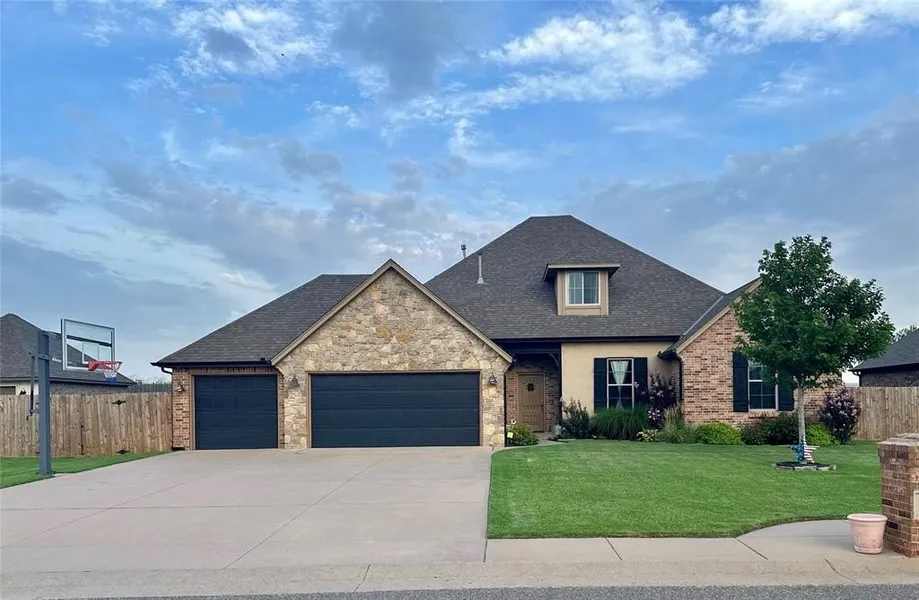 Exquisite Residence in the esteemed Windmill Park Estates community, situated within the prestigious Piedmont School District! This impeccably maintained home boasts 4 generous Bedrooms, 3 luxurious Full Baths, a designated Home Office Space/5th bedroom, and an Upstairs 2nd Living Area. Upon entry, the inviting ambiance is immediately evident, featuring rich wood-like flooring, a Gas Fireplace, and an abundance of natural light flowing through large windows. The residence exudes a bright and airy atmosphere, enhanced by newer carpeting, fresh paint, and a well-designed open floor plan. The gourmet Kitchen is fully equipped with a 5-burner gas range, stunning black granite countertops, a corner walk-in pantry, large island complete with a breakfast bar, and a spacious eat-in dining area. The private Owner's Suite is conveniently positioned separate from the other bedrooms, offering direct access to the outdoor patio, a lavish 5-piece bath with dual vanities, a large soaking garden tub, a spacious shower with a river rock bottom, and an expansive closet with direct connection to the laundry facilities. Upstairs, the versatile Bonus Room features a full bathroom and an additional bedroom with a sizable walk-in closet. Outside, the property showcases a covered back patio, a fully guttered roof line, a wood privacy fence, and a storm shelter with electricity, all overlooking serene farmland and Piedmont High School. The community is renowned for its welcoming ambiance, with amenities such as lighted walking trails, a playground, tennis and basketball courts, a pavilion, and a vast open area for recreation. Discover the endless possibilities and exceptional features this stunning residence has to offer. Don't miss the chance to experience luxury living at its finest - schedule a showing today!