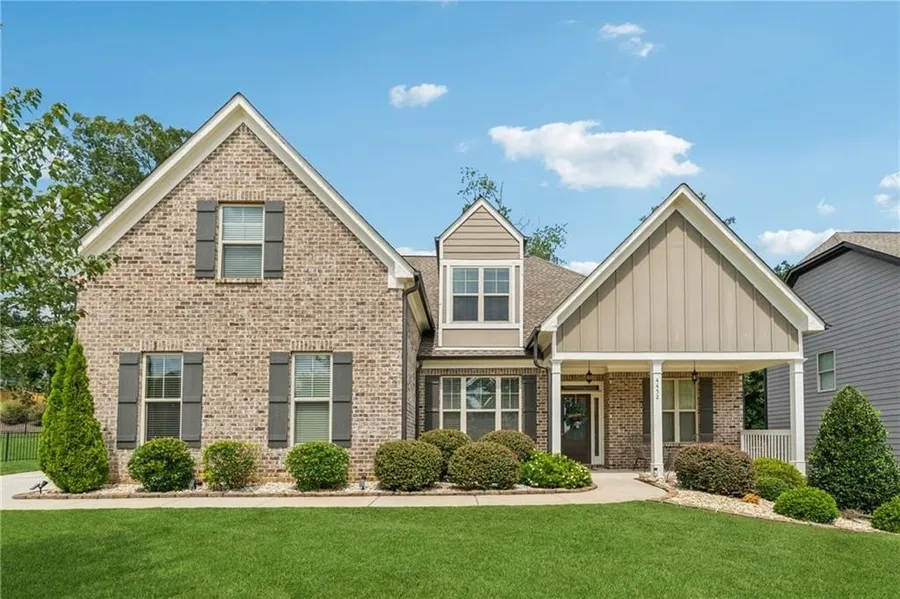 Welcome to this stunning ranch-style home in the highly sought-after Orchard at Mill Creek community, ideally located just minutes from I-85, Chateau Elan, and top-rated Mill Creek schools. This thoughtfully designed residence features 4 spacious bedrooms and 3.5 bathrooms, including a versatile upstairs loft with a full bath, perfect as a fourth bedroom, media room, or home office. The open-concept layout boasts a seamless flow from the elegant dining area with coffered ceilings to the spacious family room and gourmet kitchen. The kitchen showcases granite countertops, stainless steel appliances, a large island, and a cozy keeping room. This home is ideal for entertaining or relaxing with family. Hardwood floors extend throughout the main living areas, with plush carpet in the bedrooms and tile in all bathrooms. The oversized owner's suite is tucked away for privacy and includes direct access to the covered back patio, a luxurious en-suite bath with double vanities, a tiled shower, soaking tub, and a generous walk-in closet. Two secondary bedrooms share a convenient Jack-and-Jill bathroom on the opposite side of the home. This home also features a stylish mudroom, laundry room with storage, and a side-entry two-car garage. Outside, enjoy the covered patio and level backyard, perfect for outdoor gatherings.