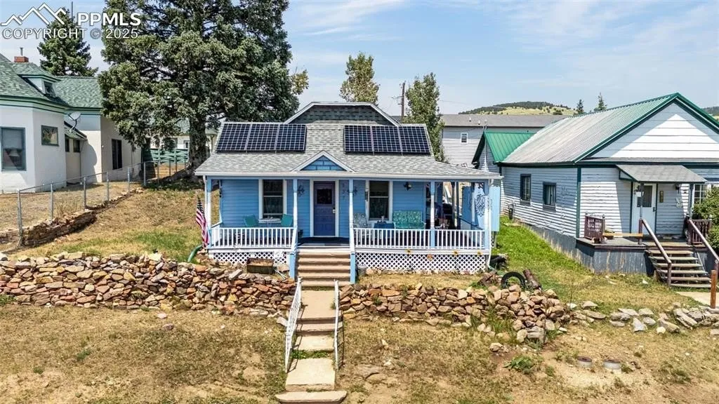 Welcome to your very own slice of Cripple Creek charm! This well-maintained 2-bedroom, 1-bathroom ranch-style home is the perfect mountain retreat or full-time residence. Nestled on a spacious lot, you'll love relaxing on the wrap-around porch while enjoying visits from the town's famous donkey herd and curious deer that wander by. Inside, you'll find a cozy living space warmed by a pellet stove, a functional kitchen with a generous pantry, and new windows that let the Colorado sunshine pour in. The home also boasts solar power for energy efficiency and a spacious backyard ready for your garden, fire pit, or furry friends. Whether you're looking for a weekend getaway, rental opportunity, or forever home, this little charmer is it.