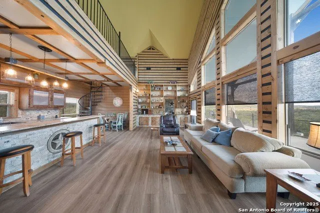 This beautiful and unique 3800 sqft home sits on approximately 6 acres in Lakehills and features a modern rustic design with quality craftsmanship throughout. The open-concept living and dining area provides a comfortable and versatile space for daily living or entertaining. The home includes two fireplaces: one in the main living area and another in the primary suite's bathroom, which also features thermostatically controlled heated floors. Smart home features include CAT5-wired cameras, smart lighting, and spray foam insulation designed for energy efficiency. Fiber optic internet service is available at both the residence and the covered RV parking area. Exterior features include a standing seam metal roof, a large workshop, and a covered RV storage area. A private 580-foot well supports an automated irrigation system for the trees. The upper deck offers extensive outdoor living space with scenic Hill Country views and striking sunsets. Located only minutes from Medina Lake and overlooking Elm Cove, this home offers a blend of modern convenience and Texas Hill Country charm.