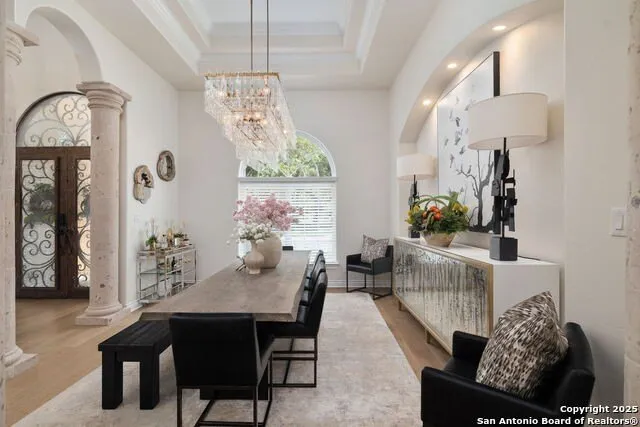 Nestled among mature trees on a spacious 1.24-acre lot, this beautifully maintained 3-bedroom, 3.5-bath home offers refined living with timeless Hill Country charm. A grand arched entry welcomes you inside, where elegant Cantera stone columns, soaring coffered ceilings, and brand-new white oak wood flooring set the tone for sophistication and comfort. The open floor plan is ideal for both everyday living and entertaining, with freshly painted interiors and abundant natural light. The thoughtfully updated landscaping and lush grounds stay pristine year-round. Additional highlights include a spacious 3-car garage, expansive living areas, and a seamless indoor-outdoor flow perfect for enjoying the tranquil, tree-studded surroundings. This exceptional property combines craftsmanship, privacy, and modern updates-all just minutes from local conveniences.