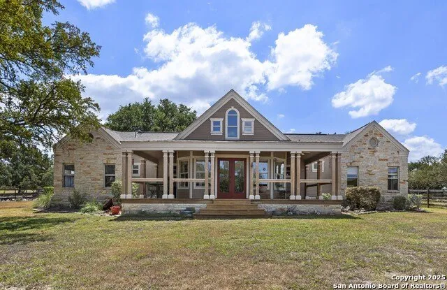 Welcome to this serene Hill Country ranch-style home, nestled on a peaceful 5.33-acre estate in New Braunfels, and with no HOA. Thoughtfully positioned at the center of the lot, this single-story, 3-bedroom, 2-bathroom home offers 2,087 square feet of bright, open living space surrounded by nature - the perfect blend of comfort, privacy, and rural charm. Step inside and you'll immediately notice the abundance of natural light pouring through panoramic double-pane windows in every room - offering stunning 360 views of the property. The spacious living room is warm and welcoming, with a vaulted ceiling, engineered hardwood floors and a striking stone fireplace that anchors the space. The island kitchen includes Vicostone Quartz counters, eat-in dining area, and views of the backyard, while the primary suite is a private retreat - featuring patio access, vaulted ceilings, a walk-in closet, and an ensuite bath with dual vanity areas and a recently updated walk-in shower. Two additional bedrooms, a walk-in pantry, laundry room, and storage area complete the layout, all with abundant windows and views of the outdoors. Outside, enjoy the wraparound front porch and covered back patio, or take a moment to relax on the secluded stone sitting area, tucked under a massive oak tree - a beautiful place to gather and relax with family and friends. The one-acre homestead includes both the 1/2-acre (.2 mile) chip-sealed driveway and the 1/2-acre fenced home site, which is beautifully landscaped with native plants and mature trees. The remaining 4.33 acres consist of open pasture currently leased to a neighboring rancher for grazing their longhorn cattle and mules - allowing you to maintain the agricultural exemption on that portion of the land and benefit from reduced property taxes. Nature lovers will appreciate frequent visits from deer, foxes, wild turkeys, rabbits, roadrunners, and even peacocks. In spring, the landscape comes alive with wildflowers, and sunsets here are nothing short of magical. Additional exterior features include: detached 2-car carport with large storage rooms on either side, workshop shed with electricity, expanded garden shed & well house, LED lighting, new attic storage above carport, private well and septic system, and chip-and-seal driveway (approx. 0.2 mi) with dual electronic gates for added privacy and convenience. While this home feels like a true countryside escape, you're just minutes away from retail, restaurants, grocery stores, medical facilities, and entertainment. It's the best of both worlds - peaceful and secluded, yet close to everything you need.