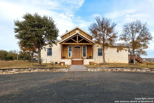 Nestled on expansive land, this home draws inspiration from an old Fredericksburg barn, blending rustic charm with modern craftsmanship. This custom 4,200 sq ft home has a split-bedroom layout on the main level, offering a private master suite with a fireplace, walk-in shower, and hydrotherapy tub, while three additional bedrooms and two baths sit on the opposite wing. The heart of the home boasts soaring vaulted ceilings framed with East Texas yellow pine timber, reclaimed bleacher seat planks, and 5" black walnut floors showcasing stunning grain variations. The fully finished basement features a bedroom, family room, full bath, and secure room, while foam insulation ensures energy efficiency. Rainwater harvesting systems, a 90' well, and solar panels complement the eco-friendly design. A spacious 2,400 sq ft, 17' ceiling, metal building with sliding doors and an additional 1,100 sq. ft. dwelling expand the property's versatility. Located just outside of New Braunfels city limits on over 10 acres, this one-of-a-kind Texas haven, offering unparalleled character, sustainability, and functionality.