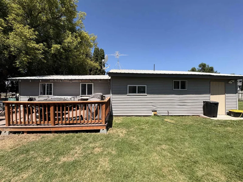 This well-kept single-level home offers plenty of space with six bedrooms and a full bath. Inside you’ll find new vinyl-plank flooring, recessed lighting and fresh paint throughout. The open living area flows into a practical kitchen (not pictured) and a laundry nook with stackable washer and dryer. Each bedroom has its own character with varied accent walls and good natural light. Located right next to Baseball, soccer field, just outside the home. Out back, enjoy a spacious fenced yard with mature trees and a raised deck—great for summer barbecues and gatherings. The metal roof, vinyl siding and updated windows provide low-maintenance peace of mind. A gated gravel drive offers ample space to park your RV, trailer or toys. With convenient access to town, schools and parks, this property combines small-town charm with room for everyone to spread out.