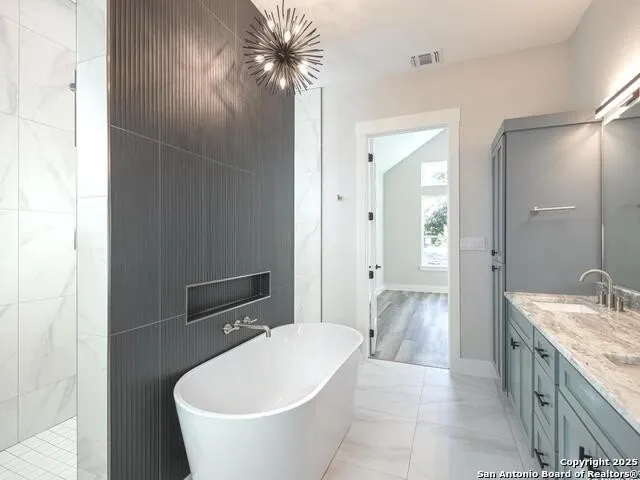 Welcome to this stunning NEW CONSTRUCTION, 1 story luxury home! Nestled on 1/2 an acre in the heart of Hill Country, this elegant, 4 bedroom, 3 bathroom residence spans 2,638 square feet of thoughtfully designed living space, perfectly combining modern sophistication with Hill Country charm. As you step into the beautiful elongated hallway, you'll be greeted by soaring ceilings and custom design elements. To the right, you'll find two spacious bedrooms sharing a Jack and Jill bathroom, each offering ample storage and privacy. At the front of the home, a 4th bedroom with its own full bathroom provides flexibility-ideal as a guest suite or home office. Continuing down the hall, you'll enter the gorgeous living room and kitchen area, where natural light pours in through large oversized windows. The open-concept floor plan is perfect for entertaining or just relaxing. At the heart of the home is the chef's dream kitchen. Boasting granite countertops, metal hood vent, built-in microwave, custom soft-close cabinetry, and an enormous walk-in pantry. The expansive kitchen counter doubles as a gathering spot, offering plenty of seating for guests to enjoy casual conversations while meals are prepared. Adjacent to the kitchen is a dining area that exudes elegance, plenty of natural light with large windows, and keeps you connected with the rest of the open floor plan. The living area, highlighted by an electric fireplace and soaring ceilings is an amazing space to relax. Retreat to the luxurious owner's suite, a private oasis featuring a generously sized walk-in closet and a spa-like bathroom. Relax in the freestanding soaking tub, with a sophisticated backsplash and elegant/modern lighting fixture. The walk-in shower, accessible from either side of the free standing tub, offers dual shower-heads, a built-in bench, and convenient storage niches-all surrounded by beautiful tile and natural light, including a double vanity and oversized mirror. Additional highlights include: A mudroom conveniently located off the two-car garage for seamless organization, A well-appointed laundry room with abundant custom cabinets for storage and ample countertop space. Step outside to your covered back porch, adorned with beautiful beams and high ceiling with a fan for comfortable outdoor living. Enjoy peaceful Hill Country vibes where deer and natural wildlife roam freely. Rivermont offers incredible amenities including a 6-acre river park with access to the Guadalupe River, picnic tables, barbecue grills, bathrooms, a pool, pavilion, playground, tennis/basketball courts, and a soccer field. Don't miss the opportunity to embrace Hill Country living while enjoying proximity to the city! This home seamlessly blends modern luxury with timeless beauty. Don't miss out and schedule your showing today!!
