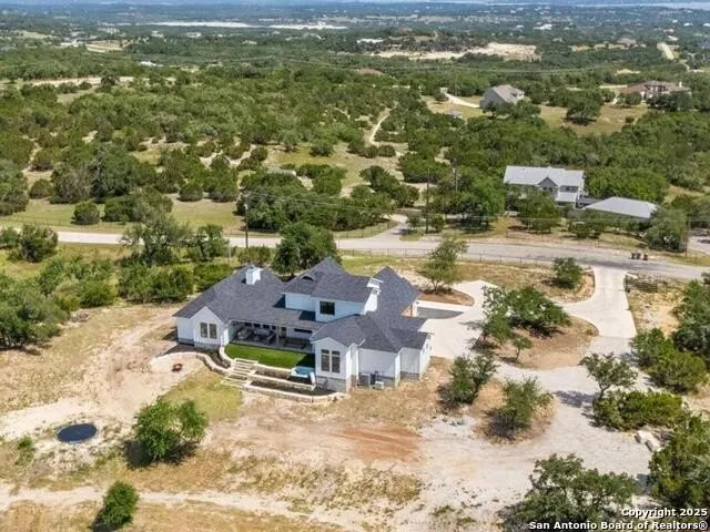 Welcome to 837 Mystic Breeze, an exceptional modern farmhouse built in 2023, nestled atop a hillside in the prestigious Mystic Shores community in the TX Hill Country. This 5-bedroom, 4-bathroom custom home offers 4,112 sq ft of beautifully designed living space on a serene 5.14-acre lot, blending luxury, comfort, and sweeping Hill Country views. The property welcomes you with a gated entrance, oak trees, and sustainable rock landscaping. Inside, tall ceilings with exposed wood beams, expansive windows, and wide-plank wood flooring create a warm and open atmosphere filled with natural light. The heart of the home is the spacious living and dining area anchored by a wood-burning fireplace with gas start. Perfect for entertaining, the open-concept layout flows seamlessly into a gourmet kitchen featuring quartz countertops, an oversized island, propane gas cooktop, electric double ovens, pot filler, farmhouse sink, microwave, dishwasher, and custom cabinetry. A generous butler's pantry adds functionality with custom cabinets, shelving, and a built-in coffee and tea bar. Designer lighting and ceiling fans throughout the home add a polished, cohesive feel. The primary suite is a peaceful retreat with a sitting area, high ceilings, and large windows framing spectacular views. The luxurious en-suite bath offers dual vanities, two walk-in closets, and a spa-style walk-through tiled shower with dual shower heads. A rare highlight is the glass-enclosed dry sauna-ideal for relaxation and wellness. Thoughtfully designed for convenience, the home also features a large laundry room with lots of space for a washer, dryer, refrigerator or freezer, plus a utility sink and custom cabinetry. A mudroom off the garage entrance includes built-in storage with coat hooks and drawers. Outdoor living shines here, with a spacious covered patio perfect for both lounging and dining. The upper backyard includes turf grass, outdoor string lighting, and hot tub, offering an inviting space to unwind while enjoying stunning views. Tiered flower beds and stone stairs lead to the lower yard with fire pit, enhancing the natural beauty of the landscape. Located in Mystic Shores-one of the Hill Country's premier communities-residents enjoy world-class amenities including two swimming pools, pickleball, tennis, basketball, and volleyball courts, a community center, two lakeside parks with grilling and picnic areas, and a 200+ acre nature preserve. 837 Mystic Breeze is more than just a home-it's a lifestyle, offering privacy, elegance, and an unparalleled Hill Country setting just minutes from Canyon Lake. Don't miss the opportunity to make this one-of-a-kind retreat your own.