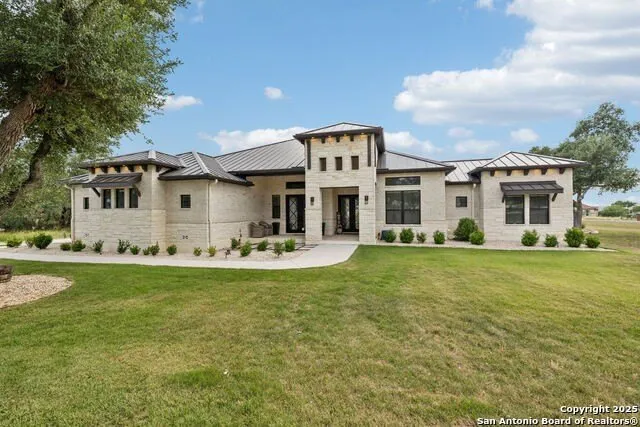 Welcome to your private sanctuary tucked away in the prestigious gated community of The Peninsula at Mystic Shores! Elegance, comfort and functionality best describes this immaculate 4 bd, 3.5 bath, custom built one-story home. 3,152 sq ft nestled away on a 1.1-acre corner lot that offers privacy plus Hill Country views. Enter your luxurious retreat through a double steel door into a custom designed open floor plan highlighting heightened ceilings and expansive windows to capture the serene hill country views and to let in an abundance of natural light. The spacious living area allows for a stunning floor to ceiling stone fireplace with a cedar mantel to accentuate the main living area of the home. Your gourmet style kitchen features a massive center island ideal for the ultimate entertaining experience! Included in this chef's dream are GE stainless steel appliances including a gas cooktop and vented hood, custom cabinetry with large amounts of storage, high-end granite countertops, an undermount sink and a large pantry. Prepare yourself a cup of coffee as you're waking up to start your day or perhaps a cup of tea before going to sleep in your coffee nook area conveniently located next to the kitchen and primary bedroom. Get comfy in your primary bedroom with large windows and capture the fabulous views. An impressive spa like en-suite bathroom that features an oversized shower with tile surround and a gorgeous bathtub, separate double vanities for space and convenience which flows into a large walk-in closet with plenty of shelving. The convenience of the primary bathroom is that it has direct access to the laundry room and dog wash area. There are 3 additional bedrooms with walk-in closets and attached bathrooms. The dedicated office space highlights a double steel door which flows out to the front patio area. Built-in cabinetry accentuates this space. Spacious 3 car garage. High end water softener and irrigation system with timer. Mystic Shores amenities include a pool area, sports courts, a playground, and private lake access, creating a community as inviting as the home itself. Easy access to Hwy 281, San Antonio, Wimberley and New Braunfels, this property offers unmatched convenience and value.