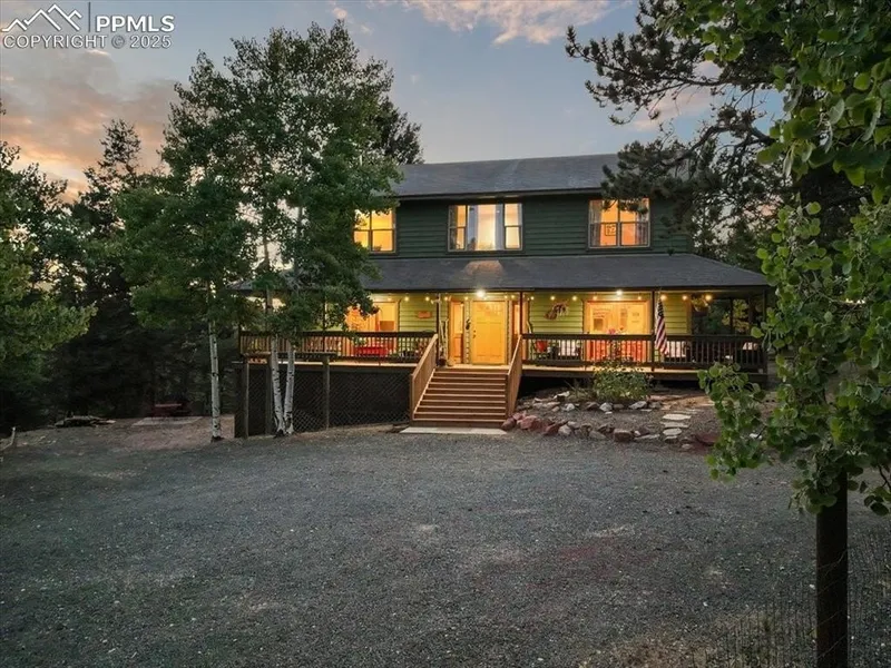 This is not just a home; it's a lifestyle waiting for you to embrace! Don't miss out on this extraordinary opportunity to claim this home as your own. Large private back yard for privacy and When you step inside this captivating setting where charm meets rustic comfort you will feel right at home. Nestled on a 1 acre wonderful treed lot, this spacious mountain cabin is your next home sweet home with soaring 9' ceilings on the main level and a warm river rock fireplace-perfect for cozy gatherings. A Second living area is in the fully finished basement. The spacious kitchen features knotty pine cabinets and plenty of counter space, pantry & inviting seating that seamlessly flows into the adjacent dining room to host all your friends & family for decades to come. Sets of French doors lead to an expansive wrap-around porch, for enjoying tranquil moments outdoors. Throughout the home are more solid knotty pine doors and beautiful flooring enhance the rustic elegance. The primary suite offers a newly updated walk-in shower, double vanity, & generous walk-in closet. The upper level features a charming loft area. Enjoy views of the property with Aspen and Pines from the large living room, designed for ample seating. The Large wrap-around deck invites you to savor the beauty of your Mountain property. Outside, the landscaped yard includes swing & hammock poles, firepit area which creates an outdoor oasis for fully fenced fun and entertainment. The gravel drive provides plenty of parking spaces. You are just 10 minutes from Divide's town center that offers grocery and the neighborhood restaurants. Hiking and OHV trails are close by! 18 min to Woodland Park and within a 1.5 hr drive to areas like Breckenridge & similar areas with world class activities. 1hr drive to Colorado Springs & airport. But don't forget the serenity of your Own neighborhood with 8 stocked ponds & lakes in the secluded Highland Lakes neighborhood. Call today for your showing!!