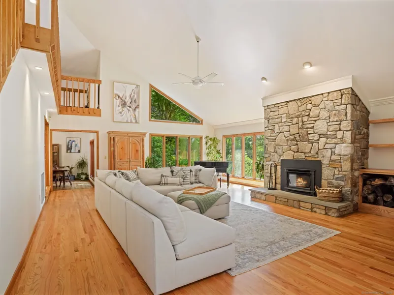 Natural light, soaring ceilings, and a dramatic stone fireplace set the tone for this spacious contemporary on one of the best lots in a quiet cul de sac. The airy living room opens to a dining area and an updated kitchen with granite counters, stainless appliances, Sub-Zero refrigerator, large island, and a coffee bar. From the kitchen sliders you step onto a spacious deck for seamless indoor-outdoor living. The main level primary suite offers two walk-in closets, a full bath with double sinks, a soaking tub and separate shower, and its own entrance to the deck. Upstairs are three more bedrooms including one with its own full bath and walk-in closet, plus a reading nook and a shared hall bath. The walk-out lower level provides a versatile finished space ready to be whatever you wish, along with abundant storage. Outside enjoy a generous level yard, a cozy fire pit area, and mature landscaping. All this is just minutes from top-rated schools, the town center, and nature preserves, with easy access to Westport, the train, and NYC.