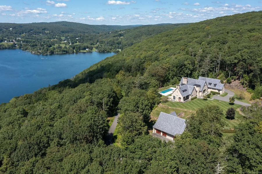 Unparalleled custom-built modern estate on 30+/- acres with jaw dropping views overlooking Lake Waramaug with 100' of lake frontage & dock. 5 bedrooms, 5 full & 2 half bathrooms. Dramatic double-height entrance Foyer with floating staircase & French doors to stone patio with outdoor fireplace overlooking the lake. Double height Living Room with towering view over the lake, floor to ceiling stone fireplace and French doors out to the patio. Dining Room with coffered ceiling. Library/Office with built-in desk and French doors to a patio. Secondary Office encased by windows, facing the lake. Eat-in Chef's Kitchen with coffered ceiling, center island and butler's pantry. Adjacent Family Room with woodburning fireplace and French doors. Primary bedroom suite with full bath, two walk-in closets and home Office. 2 guest Bedrooms en suite and 2 guest Bedrooms with shared bath. Elevator. Walls of glass. Exquisite hardwood floors. Home Theater. Golf simulator. 1,000 bottle Wine cellar. Billiard room with wet Bar. Gym. Music room. 4-5 car attached garage with electric chargers. Infinity pool with limestone terrace. Hot tub. Outdoor Kitchen. Geo-thermal heating/cooling. Mahogany windows & doors. Backup generator. Irrigation system. Outdoor firepit. Separate 2-bedroom guest house. Large Barn. Gated entrance. Private. Abuts Land Trust with hiking trails. Close to New Preston Village. Must see!