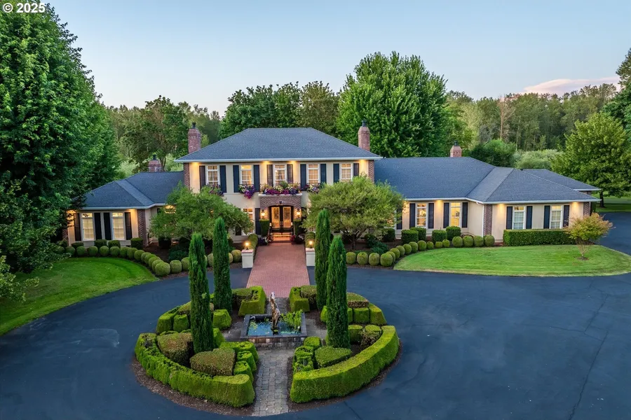 Stunning French Country Estate on 8.75 acres along the South Santiam River! This dream property offers 5 bedrooms and 4.5 baths, with the primary suite on the main level featuring a cozy fireplace, walk-in closet, jetted tub, and French doors to a covered patio. The home boasts 6 gas fireplaces, extensive built-ins, and a spacious layout perfect for entertaining - from patios and porches to a charming sunroom. The second main-level bedroom includes a sauna and connects to the den. Upstairs are 3 additional bedrooms plus a bonus room with balconies overlooking the grounds. Outdoors you'll find a putting green, horseshoe pit, greenhouse, fenced garden, large shop, and a barn with a full bath and loft - ideal for gatherings. A true country retreat where comfort, luxury, and natural beauty meet - come make this dream estate your reality! Looking to have a wedding venue or a bed and breakfast...