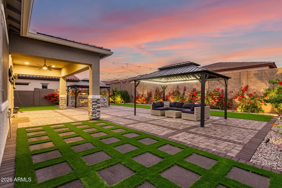 Impeccably upgraded and truly move-in ready, this exceptional home features over $100k + in thoughtfully curated, high-end enhancements, with every detail intentionally designed and flawlessly executed. Striking designer landscaping creates unforgettable curb appeal and sets the tone from the moment you arrive. The heart of the home is a chef-inspired kitchen with premium Cafe appliances, custom finishes, and a layout that blends beauty and function ideal for both everyday living and entertaining. The primary retreat offers a serene escape, highlighted by a spa-like ensuite with an indulgent shower and refined finishes throughout. Outdoors, a resort-style backyard invites year-round enjoyment with an outdoor kitchen, multiple pergolas, and spaces designed for both relaxation & gathering. The garage is a standout feature, offering epoxy flooring, a dedicated work area, and custom built-in storage, perfectly designed for organization, hobbies, and functionality. Added bonus, a whole-home water filtration and softening system, adding comfort and long-term value. Located in one of Goodyear's most desirable 55+ active adult communities. Community amenities include 29,000. sqft Village Center, Cafe & Bar, 2,000 sqft Fitness Room, Aerobic & Yoga Room, Locker Rooms, Tech Wing, Event Room, Art Studio, Dog Park, Pickleball Courts, Bocce Ball Courts, Tennis Courts, Hiking /Biking Trails. Don't miss the opportunity to make this exquisite residence your own and experience luxury living at its finest!