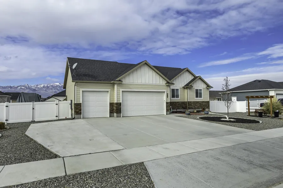 Impeccably maintained and nearly brand-new, this five-year-old rambler sits on a generous lot and invites easy, comfortable living. The open main level boasts vaulted ceilings, granite countertops, and a serene primary suite with a private en-suite bath. Two additional bedrooms and a full bath complete the living spaces. Upgrades include self-closing kitchen cabinets and drawers, a tankless water heater, an adjustable TV mount above the fireplace, Ring doorbell and cameras, and built-in garage shelving. The expansive basement adds a spacious family room, a guest-ready bedroom and bath, plus ample storage and cold storage. Outside, enjoy RV parking, a lush xeriscape yard with complete irrigation if you want grass, tree and plant drip systems, solar-lit front posts, a cornhole court, a wood swing set, and a gazebo on a concrete pad with curbing. The mudroom/laundry area enhances everyday c...