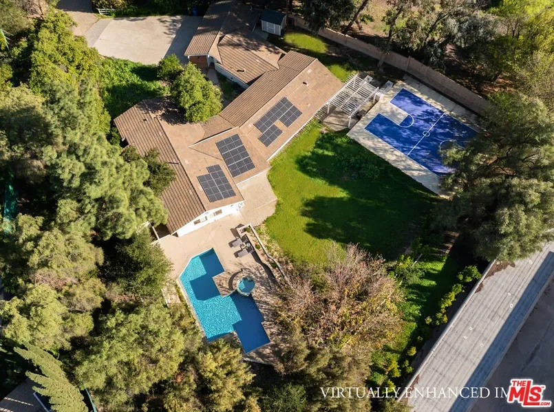 Behind the gates of Hidden Hills, this light-filled single-story estate offers a relaxed yet sophisticated California lifestyle on nearly 1.5 flat, private acres. Thoughtfully updated and designed for effortless entertaining, the home blends classic ranch character with modern comforts and smart-home technology. At the center of the home is an open chef's kitchen featuring Thermador appliances, custom cabinetry, and seamless connection to the dining and living areas. A sunken living room off the kitchen creates an intimate gathering space, while a second elevated living area above the dining room offers a more formal entertaining setting. Sliding doors open to a covered patio with an outdoor BBQ kitchen, sink, and mini refrigerator, extending the living space outdoors year-round. The primary suite is a true retreat - generous in scale with vaulted ceilings, a dedicated sitting area, and peaceful views over the grounds. The spa-inspired bath features dual marble vanities, a freestanding soaking tub, separate glass shower, and private water closet, along with a large walk-in closet. Three additional bedrooms are located down the hall, two of which enjoy views toward the pool. A separate guest bedroom and bath provide ideal accommodations for visitors. The backyard is pure Hidden Hills living: a pool and spa, open entertaining terrace, and basketball court, all surrounded by mature landscaping and broad lawns. Additional amenities include a converted garage flex space, attached two-car garage, Lutron lighting system, and solar panels. Residents of Hidden Hills enjoy exceptional community amenities including equestrian facilities and riding trails, tennis courts, community pool, recreation center, and performing arts theater - within one of Southern California's most coveted guard-gated enclaves. A rare opportunity to own a turnkey estate where space, privacy, and everyday livability come together in the heart of Hidden Hills.