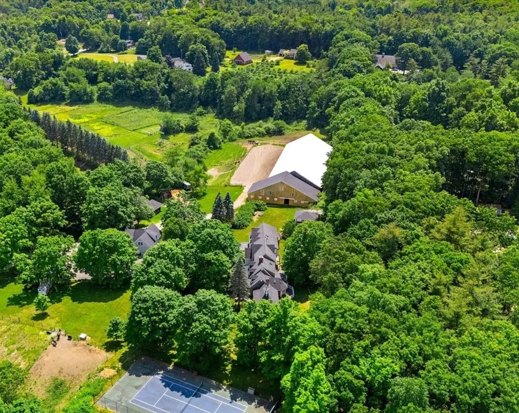Welcome to a rare equestrian paradise on 10+ private, tree-lined acres in the heart of sought-after Hollis. This exceptional estate blends timeless elegance with premier horse facilities, all just minutes from shopping, dining, and the Mass border. The main residence offers 6+ bedrooms, 4 baths, and dual primary suites—one on each level. The upper-level primary features a spa-like en-suite, expansive closets, and a private deck. Throughout the home, you’ll find rich hardwood floors, multiple fireplaces, and an effortless blend of formal and informal living spaces. A wraparound porch, finished lower level, and 3-car garage complete the home’s offerings. Outdoor living is equally impressive with a heated gunite pool, custom patio, full outdoor kitchen, and pool house with living room, kitchenette, and two baths. A tennis court enhances the resort-style experience. Equestrian amenities include two 12-stall barns with tack/feed rooms, wash stall with hot water, and expansive haylofts. A 180’ x 70’ indoor arena with viewing room, outdoor riding ring, and acres of lush, fenced paddocks offer world-class riding conditions. A charming guest house with a 2-bedroom apartment and potential 3-stall barn or workshop adds even more versatility. This is a once-in-a-lifetime opportunity to own one of Southern New Hampshire’s premier equestrian estates.