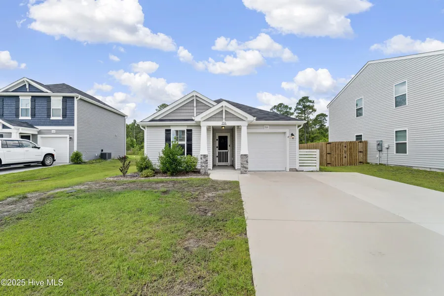 Welcome to 206 New Home Place in Holly Ridge, NC! This charming 3-bedroom, 2-bath craftsman-style home offers comfort, character, and convenience in one beautiful package. Nestled in a quiet community, the home features an open-concept living space perfect for both relaxing and entertaining. The kitchen is the heart of the home, highlighted by a stunning butcher block island that provides ample prep space and a warm, rustic touch. The spacious primary suite is a peaceful retreat, featuring a custom shiplap accent wall, a generous walk-in closet, and a private en suite bath complete with a double vanity. Two additional bedrooms offer flexibility for guests or a home office. Thoughtfully designed with modern finishes throughout, this home blends style and function effortlessly. Located just a short commute from both Wilmington and nearby military bases, 206 New Home Place offers the ideal balance of coastal living and accessibility. Whether you're enjoying quiet mornings on the porch or hosting gatherings in the open living area, this home has something for everyone. Don't miss your chance to enjoy the charm and comfort of this beautiful Holly Ridge home--schedule your showing today!