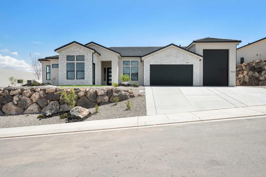 Boasting 10' ceilings and a welcoming fireplace with floating shelves, the interior is both inviting and spacious. The kitchen features a striking contrast of warm, bright cabinetry paired with dark fixtures and finishes, creating a perfect balance of elegance and modern style. The primary bedroom is generously sized and highlighted by a stunning A-frame vaulted ceiling, transitioning seamlessly into the regal primary bathroom, complete with a freestanding tub and a large walk-in closet. Beautiful guest spaces are designed with quality fixtures and finishes, ensuring comfort and style. Upon entering from the garage, you'll be greeted by a thoughtfully designed drop zone-perfect for backpacks, bags, groceries, and more. And speaking of the garage, it includes an RV garage that offers plenty of room for your toys and gear. Recently completed backyard landscaping enhances the home's appeal, featuring lush astro turf, a cozy gas fire pit, and a lowered block wall that opens up to breathtaking views of the surrounding mountains.