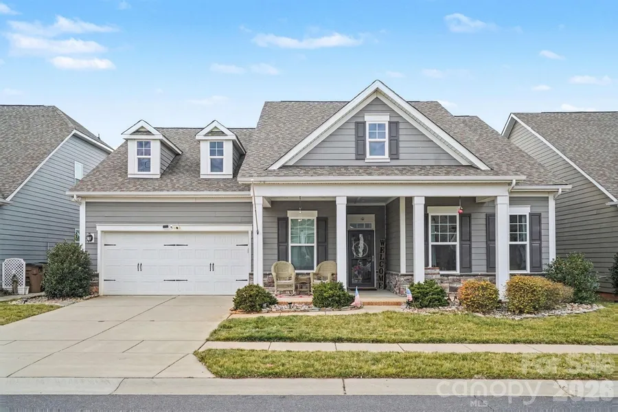 Beautifully maintained 2019 ranch offering highly desirable single-level living in one of Indian Trail's most sought-after communities. Popular Bradbury floorplan with open-concept design, tall ceilings, and abundant natural light. Split-bedroom layout provides privacy, plus a private study that can function as a third bedroom. Spacious living and dining areas flow into a well-appointed kitchen featuring granite countertops, gas cooktop, double wall ovens, and an oversized island with breakfast bar. Primary suite includes tray ceiling, dual vanities, walk-in closet with direct access to laundry room, and oversized tile shower with glass enclosure. Private guest suite with full bath. Additional features include laminate wood and tile flooring, walk-in closets, pantry, attic pull-down storage, cable prewire, and custom-sized curtains that convey. Outdoor living includes covered front porch...