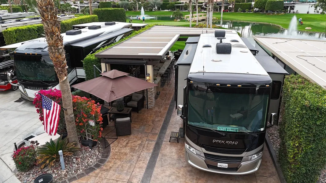 Outdoor Resort Indio is a Class A Motorcoach resort. This is an RV lot. Lot #239 at Outdoor Resort Indio is a thoughtfully designed RV resort lot offering privacy, golf course, lake, and mountain views, along with inviting outdoor living. A five-year-old, well-anchored roof covers a beautiful L-shaped Alumawood pergola with stacked stone pillars, enhanced by abundant recessed lighting and a generous front covered area-perfect for storing chairs and cushions during the rare desert rain. The outdoor kitchen includes granite countertops with a wrap-around bar, all-stainless appliances, a built-in Blaze BBQ and refrigerator, oven, dishwasher, hot water, garbage disposal, and ample storage. A TV on a Televator swivels for ideal viewing, while three electric screens, two ceiling fans, and three ceiling heaters provide year-round comfort. The stamped and sealed concrete RV pad and kitchen area create a clean, finished look. Enjoy golf course, lake, fountain, and bridge views with stunning sunsets, all without walk-by golfers or motorcoaches across the street. A private front seating area with bougainvillea hedges-maintained by the HOA-offers a peaceful spot for morning coffee. Partially furnished and pet-friendly, with a dog area directly across the lot, this is a quiet, private setting ideal for relaxed resort living.