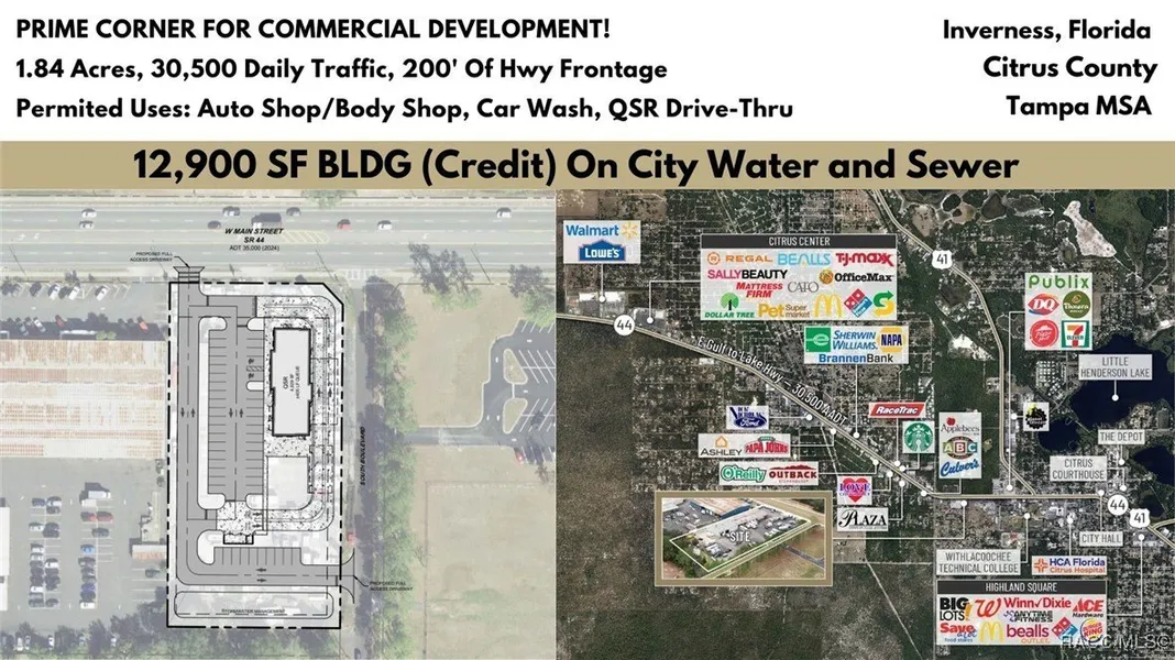 Strategically positioned on the southwest corner of SR 44/W Main Street within the city limits of Historic Downtown Inverness, this property boasts over 200 feet of highway frontage and offers seamless ingress and egress from two roads. Currently occupied by a thriving RV Sales and Repair company, the facility, originally constructed in 1971, spans 12,900 square feet, including a 2,850 square feet sales department and a 10,320 square feet Repair Garage. With 15 grade-level receiving doors ranging from 10 to 14 feet, six of which feature pull-through capabilities, as well as 12 to 16 feet high ceilings, 3 and 4-phase electrical supply, and three in-ground automobile/RV hydraulic lifts, the property is well-equipped for various commercial activities. It's noteworthy that the operating business is in the process of expanding and relocating to a new location and is not available for sale. Prime location for high-intensity commercial development, this subject property is connected to City Water and Sewer, situated on a spacious 200'x400' corner lot totaling 1.84 acres. Zoned C-Commercial, it allows for a diverse range of uses, including all retail operations and other general neighborhood commercial activities including Medical/Professional Office, with the flexibility of up to a 70% FAR lot coverage. Disclaimer: All information provided herein is for marketing purposes only and is not guaranteed for accuracy. Prospective buyers or tenants are encouraged to conduct their own independent due diligence. The seller, broker, and associated parties make no representations or warranties, expressed or implied, as to the accuracy or completeness of this information. All dimensions, zoning details, financial data, and other property-related facts should be independently verified. Please consult with appropriate licensed professionals before making any investment or purchasing decisions.