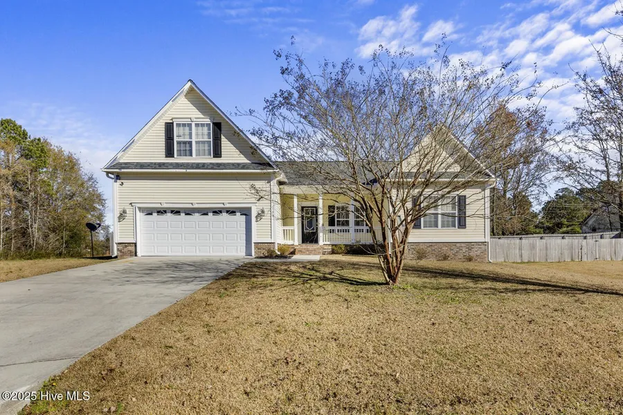 Welcome home to 103 Cherrybark Drive! This 4-bedroom home with a bonus room and 3 full baths offers over 2,200 square feet on a .62-acre corner lot with a privacy-fenced backyard. Located outside city limits with no HOA, the home features fresh interior paint, new upstairs carpet, and a 2018 roof. Inside, enjoy a bright, open living room with vaulted ceilings and LVP flooring throughout the main level. The kitchen offers ample cabinet space and a pantry, flowing into the dining area-ideal for everyday living and entertaining. The split floor plan includes a main-level primary suite with dual sinks, a soaker tub, and a walk-in closet. Two additional bedrooms, a guest bath, and a laundry room complete the first floor. Upstairs features a third guest bedroom, another full bath, and a large bonus room perfect for a home office, playroom, or additional bedroom. Outside, relax on the covered front porch or enjoy the large backyard with plenty of room for kids, pets, and gatherings. Space, comfort, and a layout families love-come see why 103 Cherrybark Drive could be the perfect place for your next chapter.