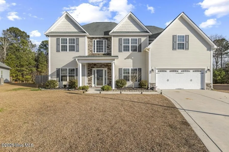 Welcome home to this stunning 4-bedroom, 2.5-bath residence offering over 3,000 heated square feet on a desirable cul-de-sac homesite in Onslow Bay. Step inside to a dramatic two-story foyer offering a formal dining room, and versatile flex space perfect for a home office or playroom. The chef's kitchen boasts a gas range, granite countertops, oversized kitchen island, and opens seamlessly to the keepers room and main living area that includes cozy electric fireplaces, ideal for relaxing evenings. Upstairs, enjoy the convenience of a large laundry room and an expansive grand ensuite complete with a double vanity, huge walk-in closet, large soaking tub, and walk-in ceramic tile shower. Outdoor living shines with a covered rear patio overlooking fruit trees and bushes, while community amenities include a pool and clubhouse. Pet-friendly home allowing 2 pets with owner approval,$150 non-refundable pet fee per pet, no bully breeds. Located just minutes to Piney Green Gate, this home blends space, comfort, and convenience beautifully.