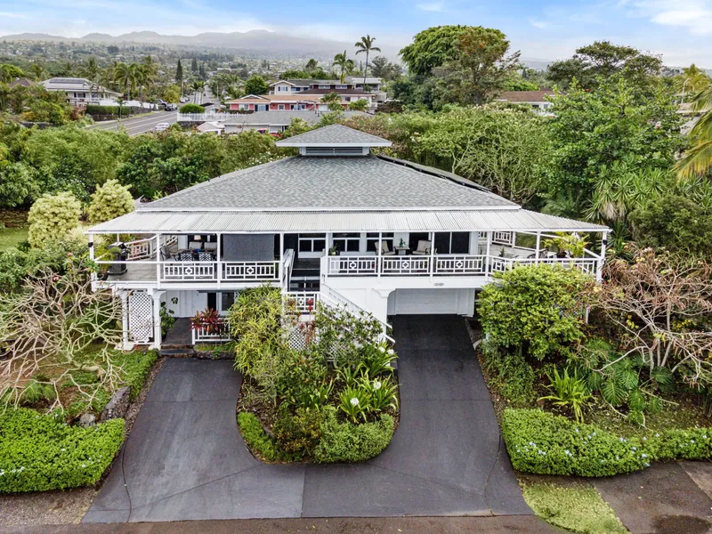 Enjoy breathtaking ocean and sunset views from this beautifully designed, steel-framed home in Kailua-Kona, set on a spacious corner lot. A full-length covered lanai extends the entire front of the home, offering an ideal setting for relaxing, dining, or entertaining while taking in the coastline. Two expansive sliding glass doors brighten the main living area and primary bedroom with natural light and frame dramatic ocean vistas. The open floor plan is enhanced by a central cupola that promotes excellent airflow, allowing cool breezes to move naturally throughout the home. Situated at an ideal elevation, you'll enjoy refreshing daytime trade winds and comfortably cool evenings. A separate lower-level living quarter (ohana) offers exceptional flexibility-perfect for guests, extended family, or rental potential. This private suite features its own entrance and parking area, a covered lanai, bedroom, full bath, and kitchenette with modern fixtures and stylish cabinetry. The main level includes three bedrooms, two full bathrooms, and a bright, functional kitchen designed for everyday comfort. Outdoors, the lush yard feels like a tropical retreat with mature landscaping, fruit trees, and stately shade trees. A covered workshop with an oversized workbench and secure storage provides added utility for hobbies and projects. The home is partially furnished, and we have an inventory list attached for your reference.