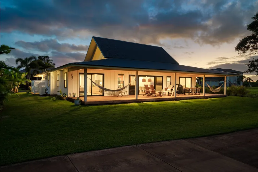 Modern Hawaiian Plantation style residence completed in 2022 and designed by the ownerarchitects with an emphasis on luxury island living. This 3bedroom, 2.5bath home offers a sophisticated open layout enhanced by abundant natural light, natural ventilation, and air conditioning in every room. The vaulted ceiling and expansive gable window define the main living area, creating a bright, airy environment and a relaxing space to gaze at the moon and stars in the evening. Interior selections feature teak-engineered wood flooring throughout, paired with custom teakfinished cabinetry that brings warmth and craftsmanship to the kitchen and bathrooms. Modern appliances and curated lighting complement the home's clean, contemporary aesthetic. An approximately 840 sq. ft. covered lanai extends the living experience outdoors, offering a generous setting for dining, relaxation, and yearround enjoym...