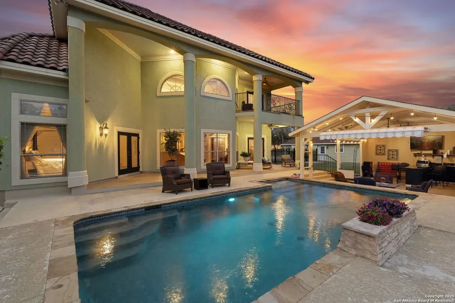 This stunning custom-designed estate offers 3 bedrooms, 2.5 baths, an attached 3-car garage, and 3,899 square feet of refined living space on 2.44 acres in the heart of La Vernia. Beautifully blending timeless elegance with Hill Country charm. From the moment you arrive, you'll be captivated by the home's exquisite craftsmanship and architectural details, including soaring 23-foot ceilings, Travertine tile, rich wood floors, and graceful arched entries. The open-concept layout features two spacious living areas and a formal dining room with French doors that open to a serene courtyard complete with a cozy fireplace and tranquil water fountain. A dedicated study with French doors provides the ideal space for a home office or can easily serve as a fourth bedroom. The spacious kitchen is a chef's dream, offering a large granite-topped center island perfect for casual dining or meal prep, barstool seating, and custom white cabinetry with ornate detailing. Warm stone tile flooring and backsplash, high-end stainless steel appliances-including a professional-grade gas range and double ovens-complement the elegant pendant lighting over the island and charming chandelier in the dining area. The seamless connection to the living room makes this the perfect home for both everyday comfort and entertaining. Retreat to the spa-like primary suite, where luxury meets tranquility. The beautifully designed bathroom showcases a dual-entry stone walk-in shower with dual shower heads, a raised whirlpool tub framed by tall windows and a decorative chandelier, and dual custom wood vanities with granite countertops and intricate detailing. Private outdoor access and an oversized walk-in closet complete this peaceful owner's retreat. Upstairs, both secondary bedrooms share a balcony overlooking the picturesque courtyard. One includes a cozy sitting area for added comfort and versatility. Step outside to your personal oasis-featuring a sparkling saltwater pool, expansive covered patio with a fully equipped outdoor kitchen, and a detached 1-bedroom, 1-bath casita with a walk-in closet-ideal for multigenerational living or guest accommodations. The fully fenced backyard, enclosed with wrought iron and high wire fencing, offers privacy and room to roam among mature trees and open skies. Additional highlights include an extra 1.5-car garage with carport, a circular driveway with ample parking, elegant iron stair railings, and upper clerestory windows that fill the formal areas with natural light. Located in a peaceful, upscale neighborhood with no HOA, this extraordinary home offers the perfect blend of custom luxury, functionality, and serene country living-just minutes from top-rated La Vernia schools, shopping, and dining.