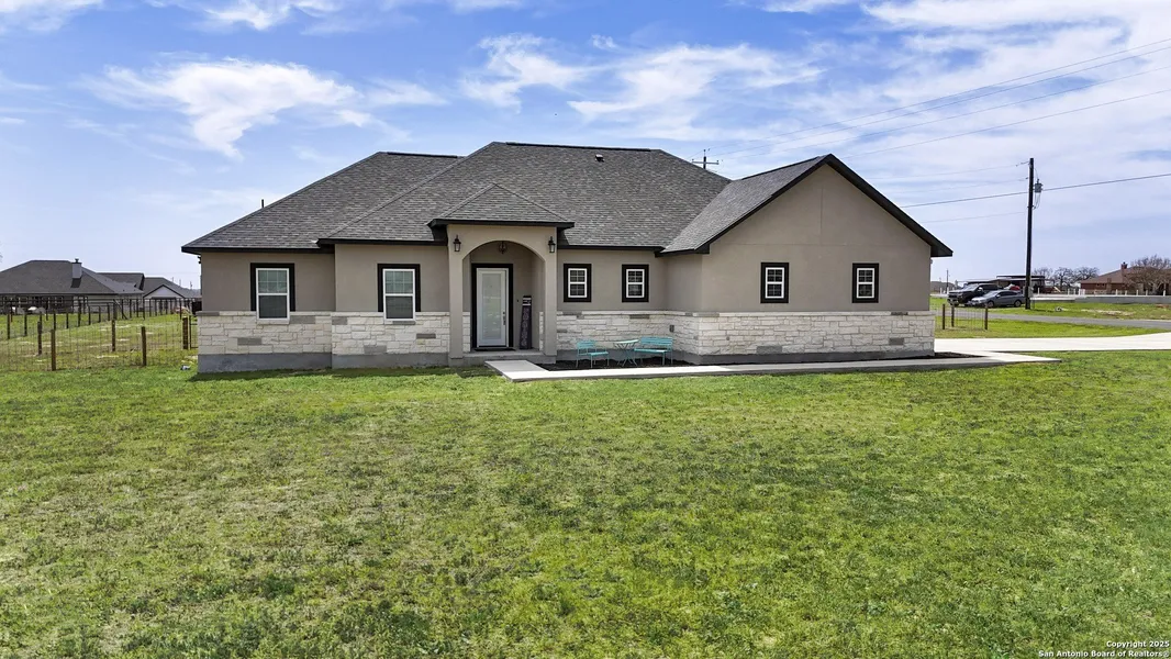 Beautiful 4-bed, 2.5-bath home on a spacious 1.02-acre corner lot in the heart of La Vernia! With 2,552 sq ft of thoughtfully designed living space, this home features soaring 12' tray ceilings, elegant porcelain tile, and an open-concept layout perfect for entertaining. The chef's kitchen boasts granite countertops, a custom backsplash, walk-in pantry, and a striking archway. The private owner's suite offers a luxurious en-suite bath with double vanity and a stunning tumbled stone walk-in shower. Step outside to a covered patio overlooking wide open space-ideal for relaxing evenings or weekend gatherings. This beautifully maintained property offers comfort, style, and room to grow-come see it for yourself!