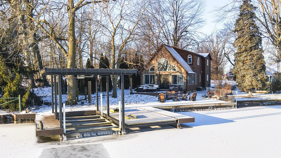 Beautifully remodeled 4 bed/2 bath home tucked away on a charming lot on Orchard Island at Indian Lake. Enjoy open water views and fabulous sunrises from the oversized deck or new paver patio. The seawall, patio, piers, and covered dock with wave runner platform were added within the last five years. Inside you'll love the spacious living room surrounded by windows that welcome in the natural light and panoramic water views. The kitchen and bar feature stunning marble and granite counters, stainless steel appliances, and stained oak cabinetry. The main floor also features a bedroom, bathroom with walk-in tiled shower, a welcoming foyer, and durable LVP flooring throughout. Upstairs you'll find a cozy sitting area, full bathroom with tub & tiled shower, and three additional bedrooms! New furnace in 2026. Appliances included with the sale are the kitchen refrigerator, range, microwave, dishwasher, and drinking water station. Negotiable items include the washer, dryer, two wine refrigerators, furniture, and some decor. Imagine how memorable your summers will be at this stunning property. Make it yours today!
