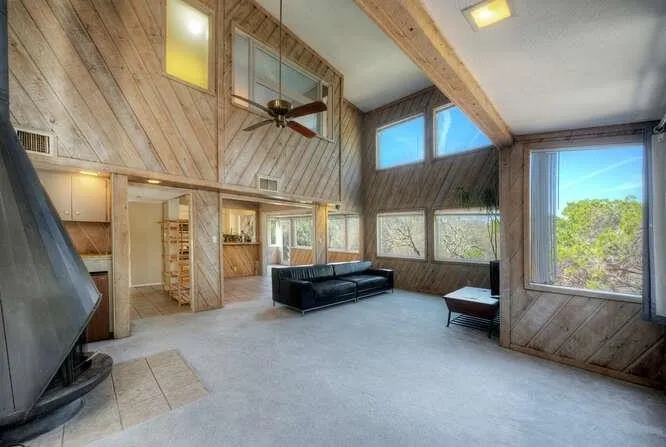 Current price, significantly below the average, reflects property condition. Create your own private retreat at 614 Sunfish, an architectural gem in the heart of Old Lakeway with all the right bones to make your vision a reality. Tucked beneath a canopy of mature trees, this multi-level home feels more like a secluded treehouse than a traditional residence. Its mid-century modern lines, rustic textures, and open layout provide a strong architectural foundation ready for your personal touch. A winding stone path and custom wooden bridge lead to the bold red front door, offering a preview of the home's one-of-a-kind character. Inside, the soaring great room with its dramatic ceilings, walls of glass, and a freestanding mid-century fireplace sets the stage for cozy nights and memorable gatherings. Diagonal cedar paneling, exposed beams, and open loft-style cutouts bring warmth, depth, and t...