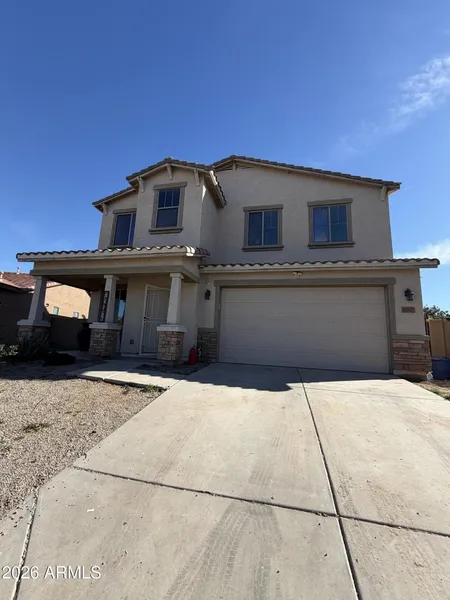 Beautifully reimagined & thoughtfully updated, this 5-bedroom, 3-bath home offers refined living with a versatile layout designed for comfort & style. Tucked away on a quiet cul-de-sac, the property sits on an OVERSIZED lot, providing added privacy & a rare sense of space in desirable Laveen. The interior features fresh neutral finishes, upgraded lighting & new flooring throughout. Tile flows through the main living areas, stairs, primary suite, & first-floor bedroom, while carpet adds warmth to the three secondary bedrooms upstairs. The designer kitchen is anchored by a large peninsula-style island with seating & showcases deep navy lower cabinetry paired with crisp white uppers, gold hardware, granite countertops, a farmhouse sink, and a stylish backsplash. All kitchen appliances are included, including the refrigerator (washer and dryer not included). The open layout connects seamlessly to spacious living and dining areas. A private bedroom and fully remodeled bathroom on the main level offer ideal flexibility for guests or multi-generational living. Upstairs features four generously sized bedrooms, all with walk-in closets, a large loft, and a convenient laundry room. The primary suite is a true retreat with a spa-inspired bathroom featuring a freestanding soaking tub and separate shower, plus an oversized walk-in closet. An attached open bonus area offers exceptional flexibility and can be used as a sitting lounge, home gym, nursery, private workspace, custom dressing or glam room with an island, content creation or podcast studio, private library or reading lounge, or additional storageallowing the space to adapt beautifully to your lifestyle. Outside, the expansive backyard with covered patio offers a blank canvas for future outdoor living or entertaining. Additional highlights include a two-car garage and abundant storage throughout. Conveniently located near parks, schools, shopping, and major access routes, this home offers an exceptional blend of space, privacy, and modern living.
