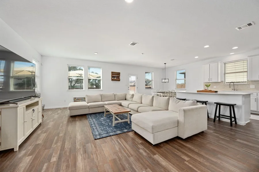 Designed for both comfort and functionality, this home offers a layout that appeals to today's buyers. An inviting front porch sets the tone, providing the perfect space to personalize for any season. Inside, all main living areas are thoughtfully located on the first floor, creating a clear separation between living and sleeping spaces, with all bedrooms upstairs. The kitchen is both practical and stylish, featuring an abundance of white cabinetry, updated lighting, and a large, fully usable island ideal for everyday use and entertaining-without the sink disrupting valuable counter space. The open flow into the living area enhances both functionality and connection. Upstairs, four spacious bedrooms and two full bathrooms provide flexibility for a variety of living arrangements. Each bedroom offers ample space and storage, and brand-new carpet installed in February 2026 gives the entire upper level a fresh, move-in-ready feel. The backyard is a standout feature, backing to MUD-maintained green space that offers rare privacy and a peaceful view. An extended covered patio and generous yard create an ideal setting for outdoor entertaining, relaxing, or future customization. Located in the desirable Larkspur community, residents enjoy access to two swimming pools, an expanded fitness center, hike and walk trails, playgrounds, a half basketball court, and a rentable clubhouse. The home is zoned to Leander ISD, including Larkspur Elementary located within the neighborhood, Danielson Middle School, and Glenn High School. Convenient access to H-E-B Plus, local dining, and planned nearby Target and Costco further enhances the appeal of this location.