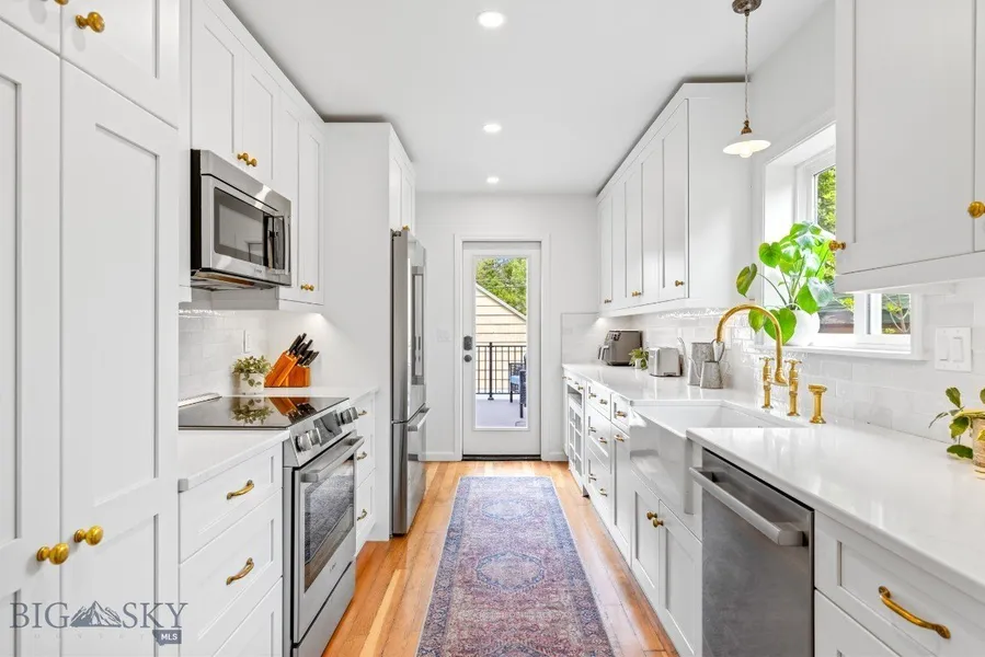Showcasing newly refinished hardwood floors on both the main and upper levels, fresh main-floor paint, updated electrical work, and upstairs bathroom renovations, 215 South 10th Street is a standout Southside offering that blends classic Livingston charm with meaningful modern updates. Ideally located just one block from an elementary school and a short stroll to downtown Livingston, this beautifully maintained 6-bedroom, 2-bathroom home spans three levels and offers existing plumbing for a third bathroom-providing flexibility for future expansion. At the heart of the home, a recently renovated kitchen delivers understated luxury with curated finishes including a deVOL brass faucet and lighting, unlacquered brass cabinet hardware, and upgraded Bosch appliances, all chosen for their quality and timeless appeal. The main floor features a spacious primary suite for comfort and convenience, along with a dedicated home office ideal for remote work or creative pursuits. Upstairs, three bright bedrooms highlight the home's original architectural character, complemented by the updated bathroom. The expansive basement offers versatile space for a home gym, studio, guest quarters, or additional storage. Outside, enjoy a generous backyard perfect for entertaining or gardening, a newly built deck, and a detached two-car garage with alley access-offering excellent ADU potential.