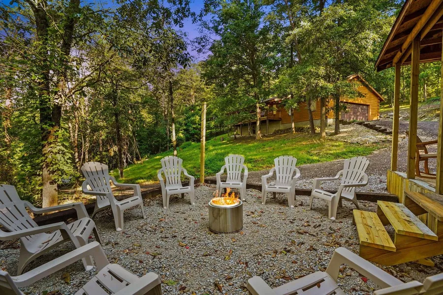 Discover this beautifully renovated log retreat nestled in the picturesque Hocking Hills, offering a perfect blend of rustic charm and modern amenities. With an impressive rental history, this property has generated $89,900 in gross revenue year-to-date for 2025. Undergoing a full cosmetic renovation in 2023, this property boasts an array of upgrades, including brand-new plumbing and light fixtures, stylish bathroom vanities, and a stunning living room/kitchen featuring a modernized ceiling with white painted tongue and groove. The addition of new hardwood flooring in the bedrooms enhances the home's warmth and elegance. The heart of the home extends into a transformed 2-car attached garage, now a vibrant game room, complete with an insulated ceiling, HVAC mini-split for comfort, and a door that still allows for garage functionality. For outdoor enthusiasts, a detached 2-car garage has been creatively converted to a covered hot tub and outdoor grill area, seamlessly connecting to a gravel fire pit pad-ideal for gatherings under the stars. Set on over 5 acres, this property offers ample space for an additional cabin at the back, making it a perfect investment opportunity. Enjoy the tranquility of your own stocked fishing pond, providing a serene escape right in your backyard. The current property management is willing to remain in place, ensuring a seamless transition and continued rental income. Additional features include a new AC unit installed in 2024 and a hot water tank added in 2025. This log getaway is not just a residence, but a thriving investment with endless possibilities. Don't miss the chance to own this extraordinary property in the heart of Hocking Hills!