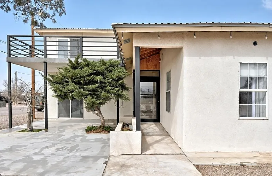 In East Heights, just outside the Marfa City limits, this gut-renovated home has clean modern finishes and a 2nd floor apartment under construction. No zoning in East Heights or City property taxes! The stucco home with custom iron work and roof deck is on large xeriscaped corner lot, and has a garage. Original 1935 home has glossy hardwoods, high ceilings, a private primary suite, and a fireplace. The home could be made into a full duplex upon completion of the apartment over the garage.