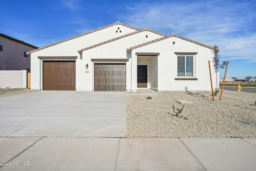 Welcome to your dream garage.. and home on a corner lot! The Ruby floor plan offers a super garage, a 4-car tandem with plenty of room for all your cars and hobbies. This brand-new construction showcases Spanish architecture and a 4-panel Center Sliding Glass Door from the Great Room to the Covered Patio! Step inside and enjoy the open-concept layout and 9'' ceilings. With 2,173 square feet of well-designed living space, this single-story offers 3 bedrooms, a large den, and 2.5 bathrooms. You'll love the 7 x 22 Lakewood Vista tile floors throughout the main living areas, offering elegance and easy maintenance. The kitchen is a show stopper with Crisp Stria Quartz countertops, a large island, Grey shaker cabinets, a 4 x 16 Golden Horizon backsplash, and a stainless steel gas range. The Amarillo Creek community is conveniently located near Route 347, which makes it easy to commute to Phoenix, Chandler, and Mesa. It is just minutes away from Maricopa's array of dining, shopping, and entertainment options. Don't miss out on this gem!