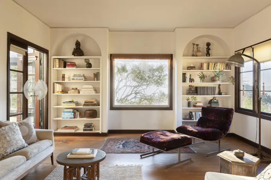 Sited on a quiet street in Berkeley's coveted Thousand Oaks neighborhood, this stately & artistic residence enjoys sweeping panoramic Bay views & is surrounded by lush gardens, volcanic rock and mature trees. Evocatively furnished by its owner, a celebrated style icon, the home is offered with a remarkable collection of furniture, art, and contents, all included with the sale. Impressive, tiled entry with cathedral-style windows and an elegant staircase creates a dreamy & poetic ambiance. Sun-filled LR opens to romantic winter garden with stunning Bay Vistas. Dining rm and vintage kitchen connect seamlessly to charming bfast room w. side deck. Upstairs features an inspiring glass-walled artist's studio and three bedrooms rich in color, texture, and artistic detail, all overlooking the Bay. Dramatic lower-level multi-use space offers tall ceilings, concrete floors, a striking minimalist bath, and opens to a lush patio and garden retreat. Extensively updated yet filled with soulful patina, this rare and magical property is ideally located near Solano Avenue, gourmet shops, scenic paths, and the natural beauty of the Berkeley hills.